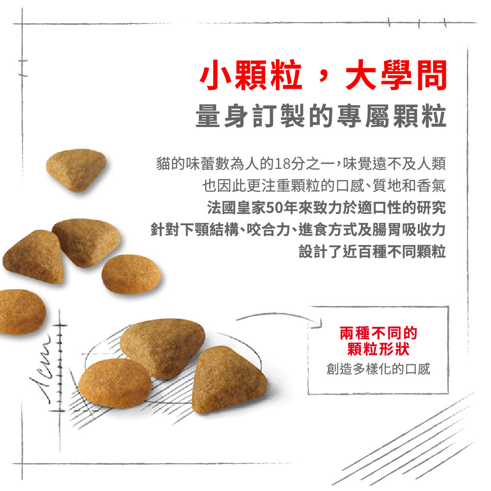 絕佳口感: 兩種不同形狀及質地的顆粒(不同蛋白質含量),獨特的口感,融入牠的口中,搭配完整的營養成份,滿足貓咪的口欲。