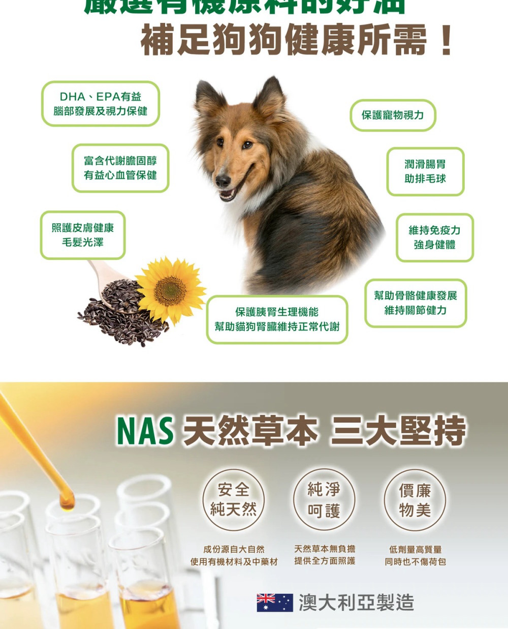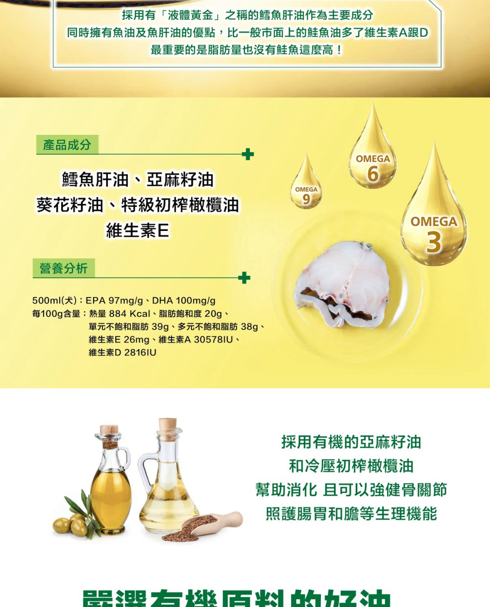 成份:鱈魚肝油、亞麻籽油、葵花籽油、特級初榨橄欖油、維生素E 使用方法:500ml(犬):每公斤每日攝取1ml(按壓一下約1ml)